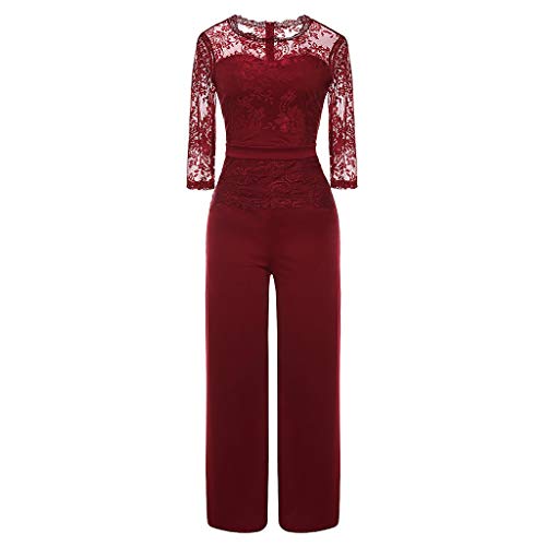 Monos Largos Elegante Mujer SUNNSEAN Mmeluco de Encaje Casual Señoras Sexy Manga Media Traje Elegante de Fiesta Moda y Noche Casual Encaje Mono Jumpsuits (XXL, Vino)