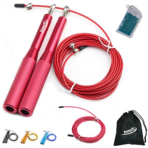 InnoTi Comba de Crossfit para Hombre y Mujer - Cuerda de Saltar de Alta Velocidad para Boxeo y Fitness - Comba de Alumino Ligera Saltos Dobles - Ajustable y con Cable Extra de Repuesto (Roja)