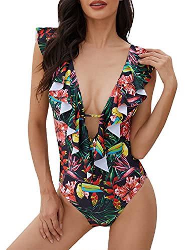 heekpek Trajes de BaƱo una Pieza Bikini Volantes Sexy Cuello en V BaƱadores de Mujer Estampado Tropical Cintura Alta Bikini Sexy Mujer
