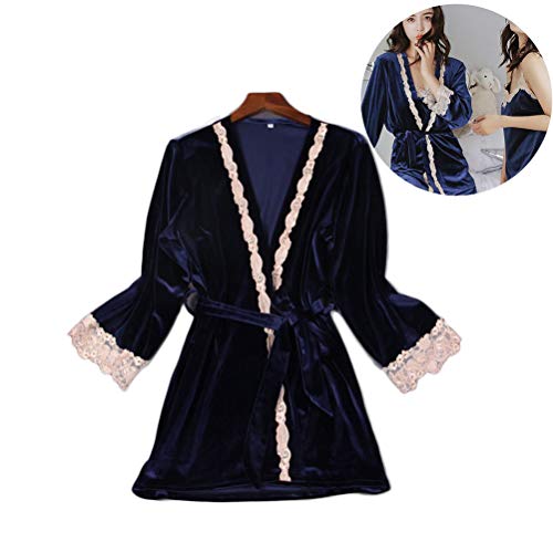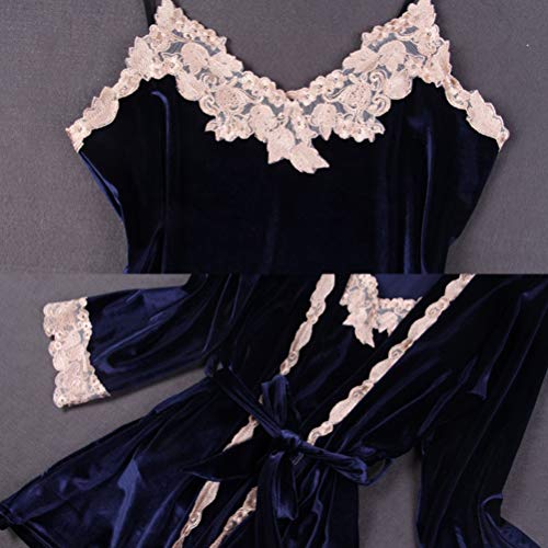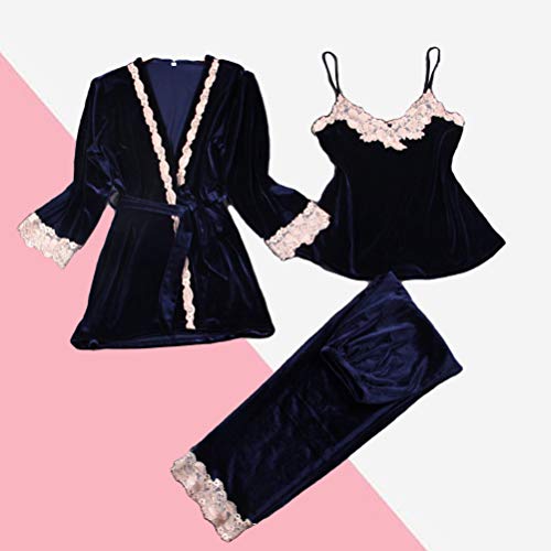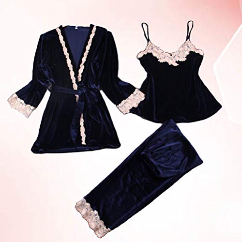 TENDYCOCO 3 Piezas Mujeres Ropa de Noche Confort Franela Mujeres Pijamas Conjuntos de Encaje Camisola Ropa de Noche de Terciopelo Señoras Pijamas Ropa de Noche Camisón L (Azul Oscuro)