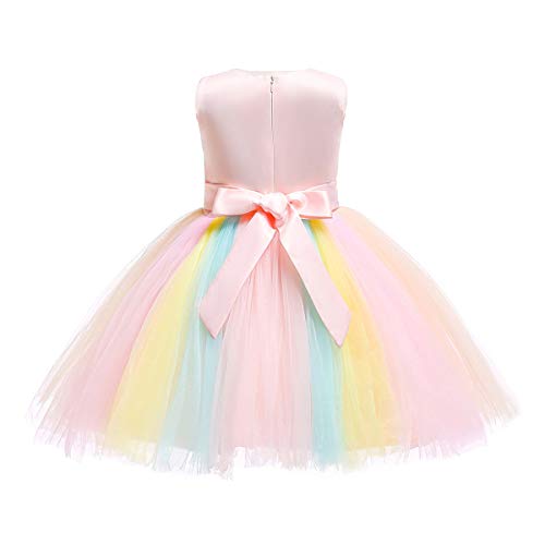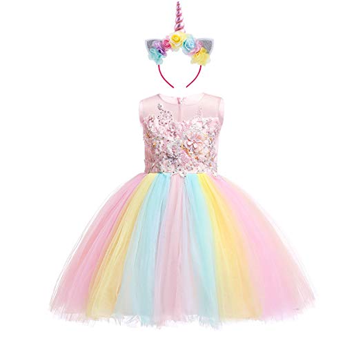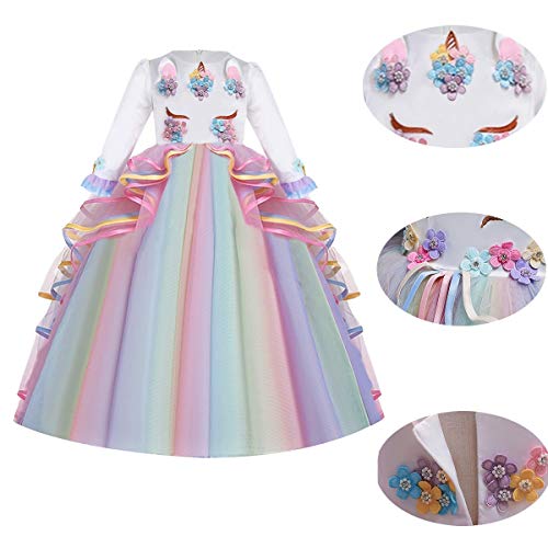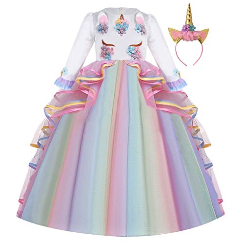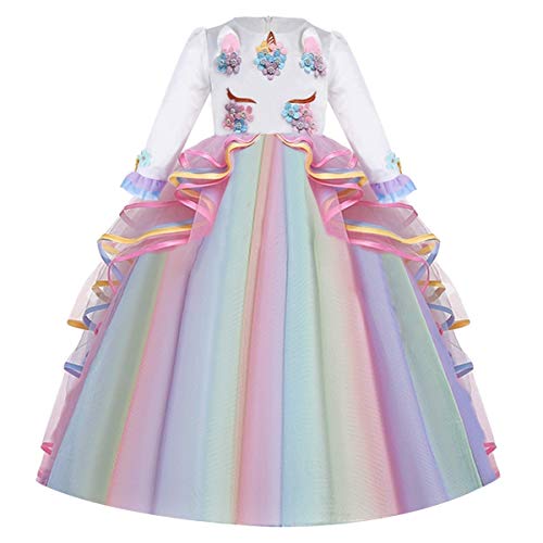 FMYFWY Niña Vestido de Unicornio Princesa Cumpleaños Manga Larga Disfraz de Carnaval Halloween Navidad Fiesta de Cosplay para Chicas Bautizo Comunión Boda Velada Ropa con Diadema Arcoiris 4-5
