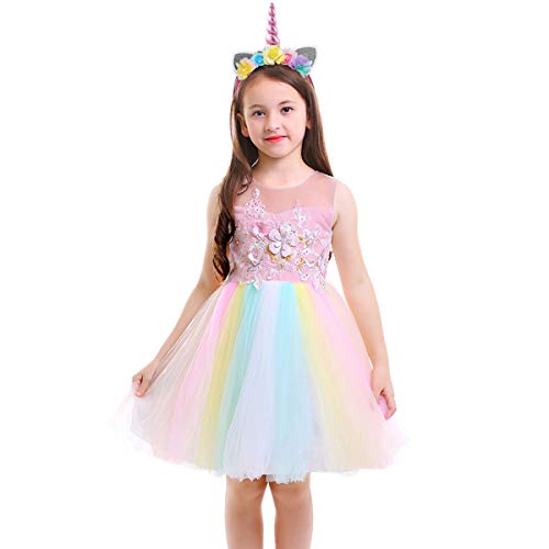 - Vestido de princesa Grimm's Fairy Tales Disfraces para Halloween Cosplay Costume para Niñas,Encantadores niños niñas sin mangas cuello redondo vestido de tul del arco iris empalmados unicornio vestidos de fiesta, partido con una diadema de unicornio, trajes 2pcs set