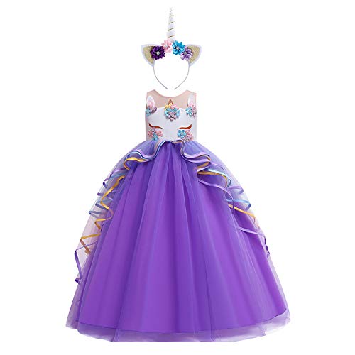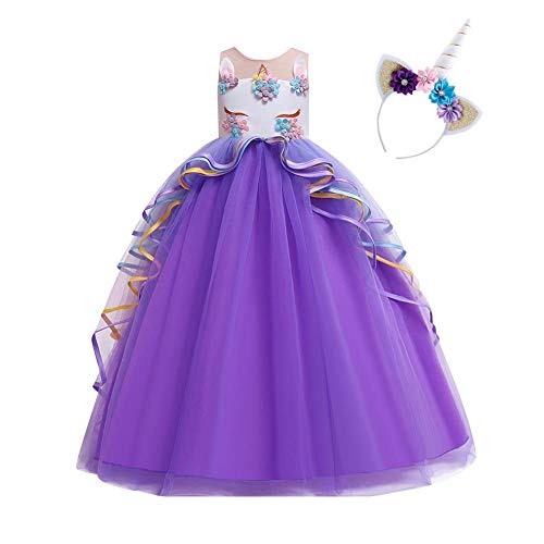 IDOPIP Disfraz de Unicornio Niñas Chicas Vestido Unicornio Princesa Traje de Carnaval Cumpleaños Comunión Cosplay Costume con Diadema Morado 6-7Años