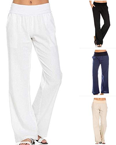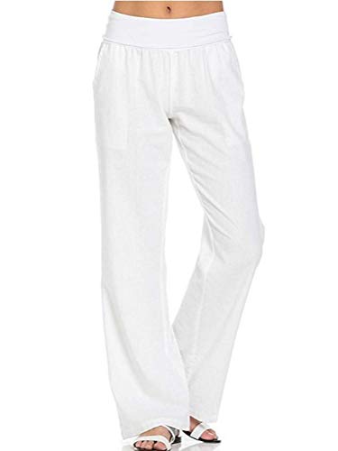 Onsoyours Pantalones De Algodón Y Lino para Mujer Sueltos Color Sólido Pantalones De Cintura Elástica Casual Pantalones De Otoño con Bolsillo Blanco XL