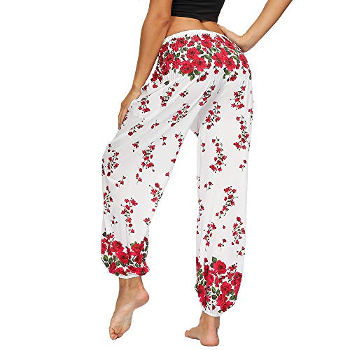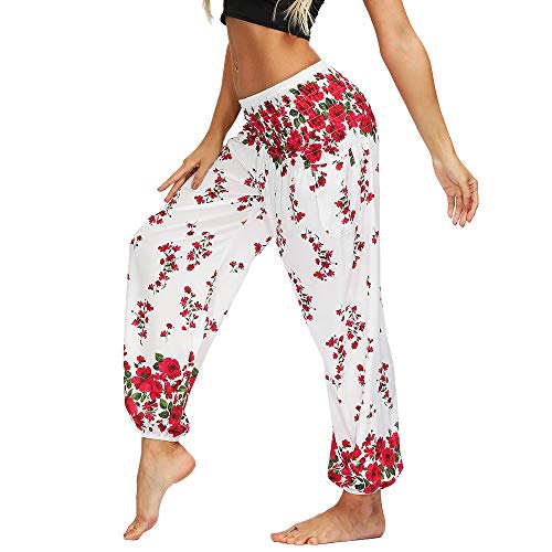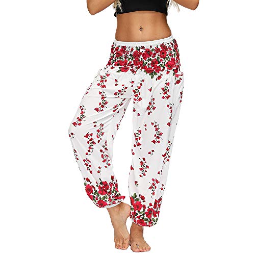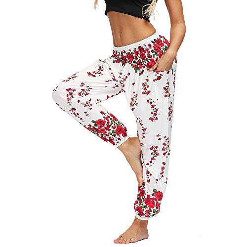 Nuofengkudu Mujer Yoga Pantalones Cintura Alta con Bolsillos Harem Hippies Baggy Tailandeses Estampado Verano Elastica Pilates Pantalon Pants Casual(Y-Blanco Floral,Talla única)