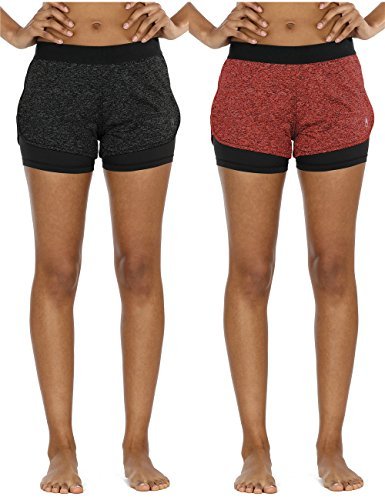 icyzone 2 en 1 Pantalón Corto para Mujer para Correr, Pack de 2 (M, Negro/Rojo)