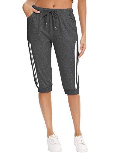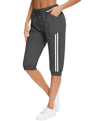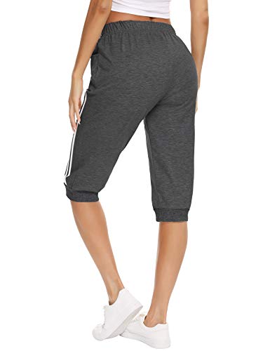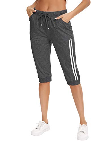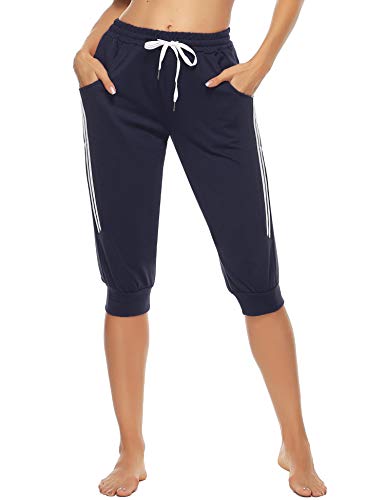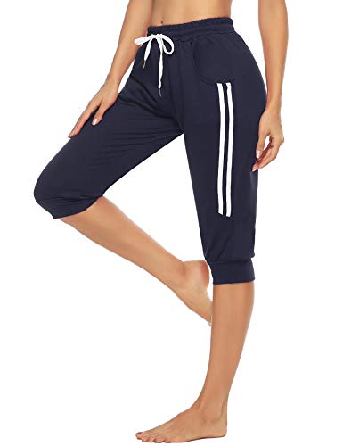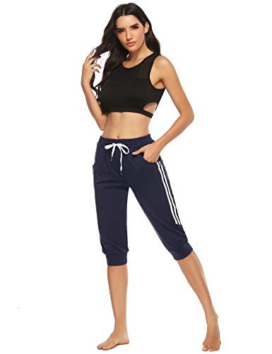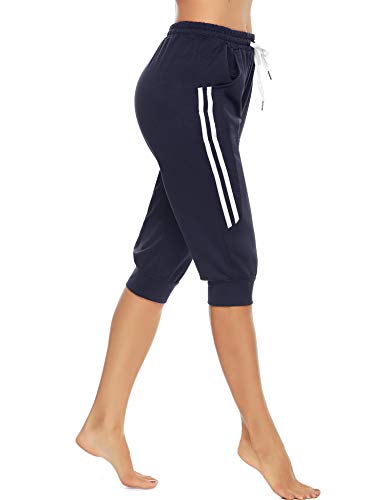 - 【Pantalones piratas para mujer】Pantalones deportivo para mujer de 3/4 de largo, diseño de pierna cónica, pantalónes capri hasta la rodilla y cintura alta, cintura con cordón elástico, 2 bolsillos laterales para artículos pequeños, rayas decorativas laterales.