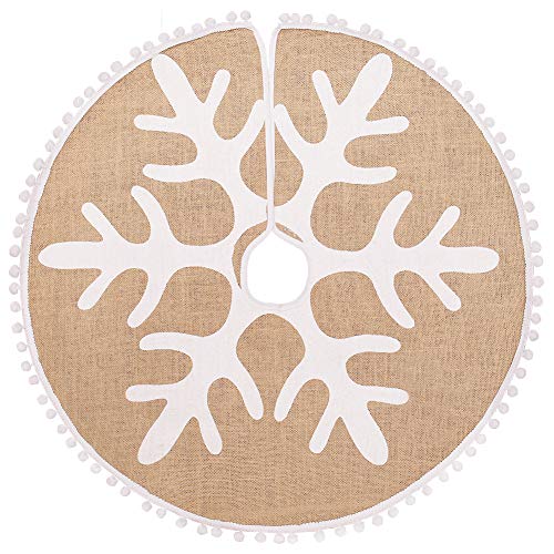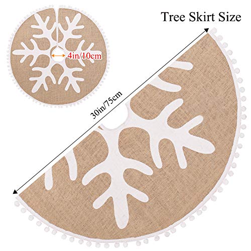 N&T NIETING Falda para árbol de Navidad de 75 cm, diseño rústico de copo de nieve blanco impreso y pequeños pompones con borde de arpillera para árbol de Navidad, 30 pulgadas