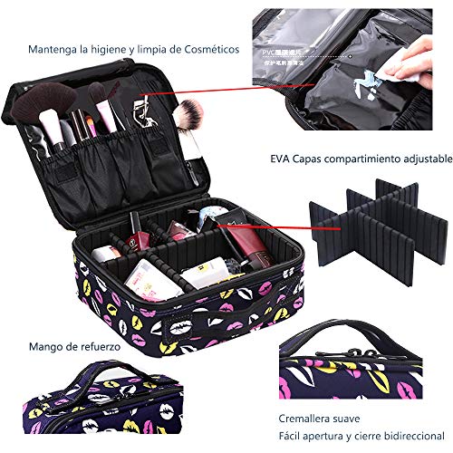 Neceser Maquillaje Impermeable Bolsa de Maquillaje Organizador A Brochas de Maquillaje Estuches Portatil Cosmeticos Bolsa Neceser De Viaje(Violeta con patron labios)