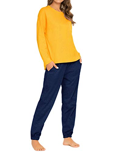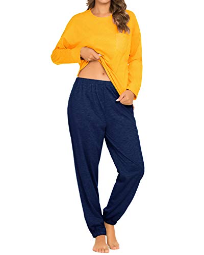 - ☬ Set de Pijamas largos de dos piezas ☬ - Parte superior e inferior. Top: cuello redondo con escote, puños y ribete con bandas y tiene 3 botones decorativos. Parte inferior: Pantalón estilo jogger con dos bolsillos laterales, cinturilla elástica elástica, puños con banda ancha.
