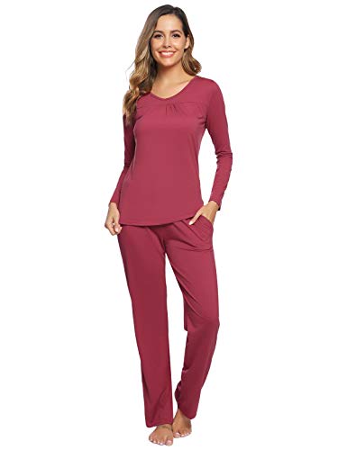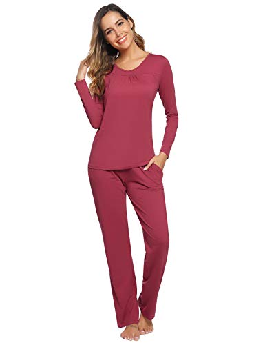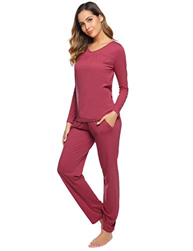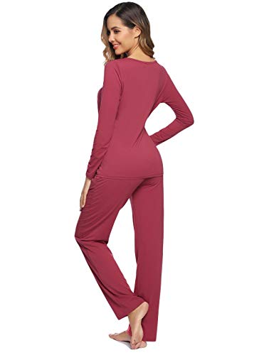 Abollria Pijamas Mujer Algodon Ropa de Domir Elegante Manga Pantalon Largos (S, Rojo Ladrillo_3)