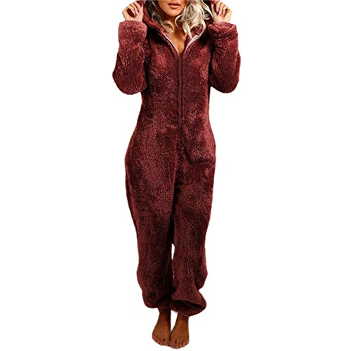 Geagodelia Pijama de peluche para mujer, pijama entero de invierno, forro polar de coral, mono de manga larga, mono con cremallera, sudaderas con capucha de peluche, ropa de noche Vino Rosso XL