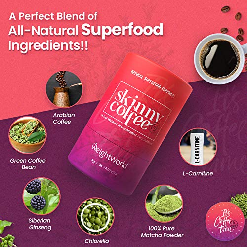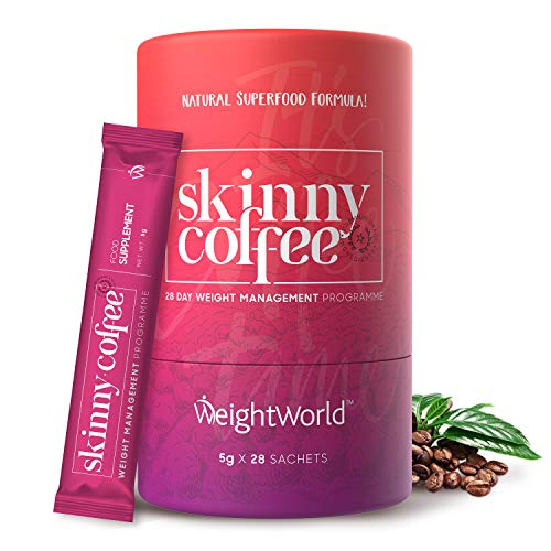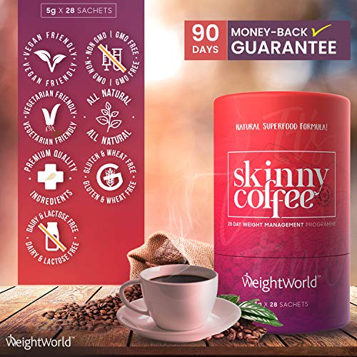 - AUMENTO NATURAL DE LA ENERGÍA: gracias a la cafeína que se encuentra naturalmente en los granos de café verde y árabe, WeightWorld Skinny Coffee es una excelente manera de obtener un impulso energizante natural para comenzar con energía por la mañana, lo que ayuda a su rutina durante el resto del día.