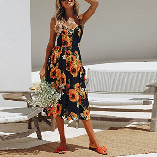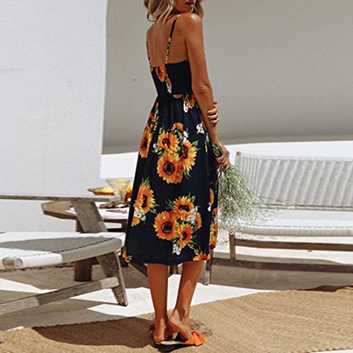Ai.Moichien Vestidos de Summer Floral Bohemia Correa de Espagueti Abotonado Vestido Midi Oscilación con Bolsillos 27 Color para Mujer L Azul Profundo Con Girasol