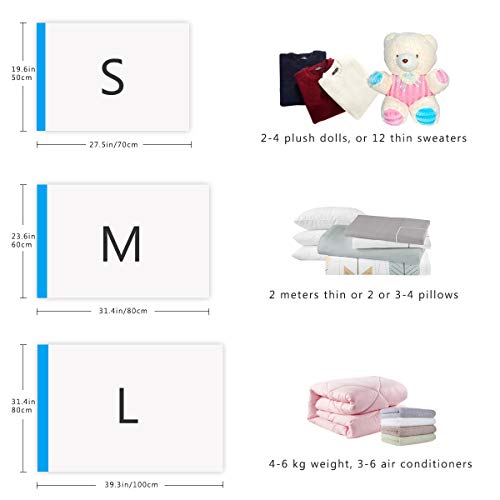 - La bolsa de vacío está disponible en 3 tamaños diferentes: bolsa pequeña (70 x 50 cm) * 2 para almohadas y peluches; Bolsa de tamaño mediano (80 x 60 cm) * 2 para ropa de temporada, como suéteres, suéteres, abrigos de invierno, etc. Bolsa grande (100 x 180 cm) * 2 para ropa de cama, como mantas, etc. puede ahorrar