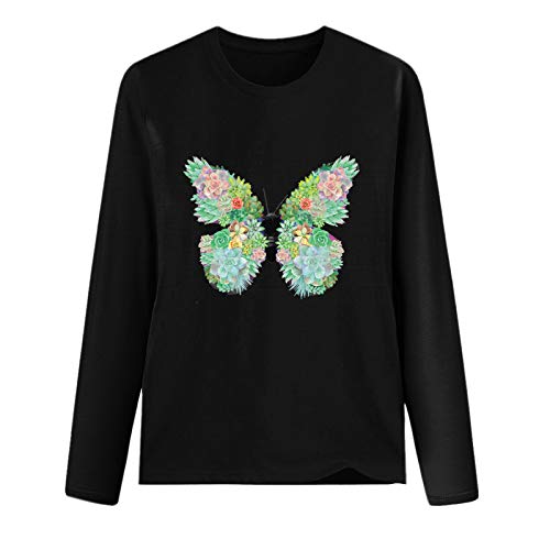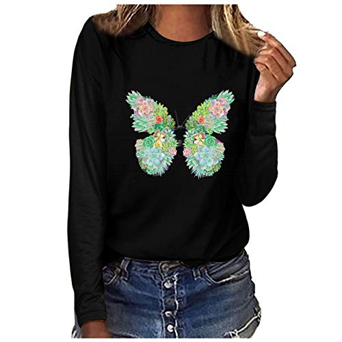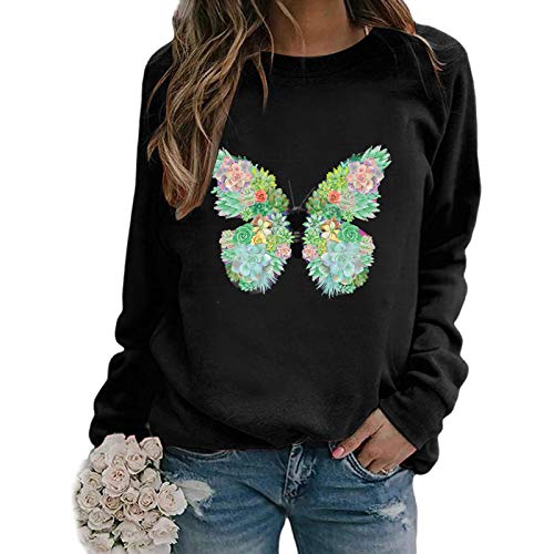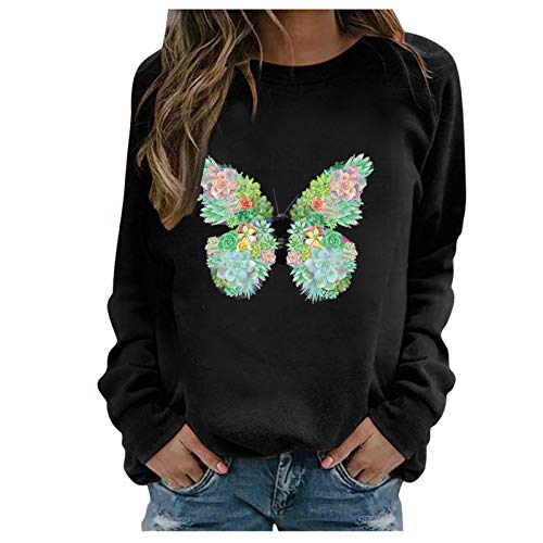 YANFANG Sudadera sin Capucha para Mujer, Camiseta Holgada Informal con Cuello Redondo y Manga Larga con Estampado de Mariposas y Blusa Superior para Mujer