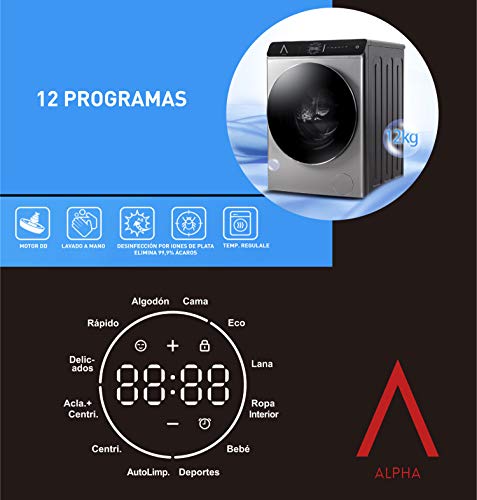 ALPHA Lavadora TITAN ELITE Motor Direct Drive 10 años de Garantía, 12 kg, 1200 rpm, A+++, Gris, Carga Frontal, Tambor de Panel de Abeja con LUZ, Evita el desgaste de la ropa. ** Alta Gama**