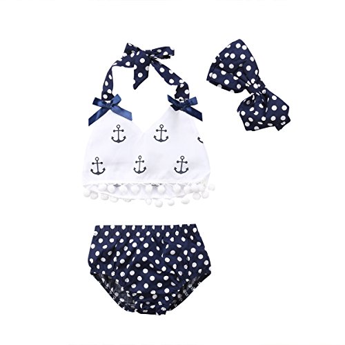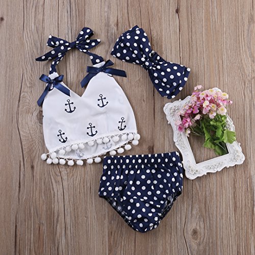 chaochao - Conjunto de 3 piezas de verano para bebé y niña, con flecos, diseño de ancla + pantalón corto de lunares + diadema para el cabello azul 0-6 Meses