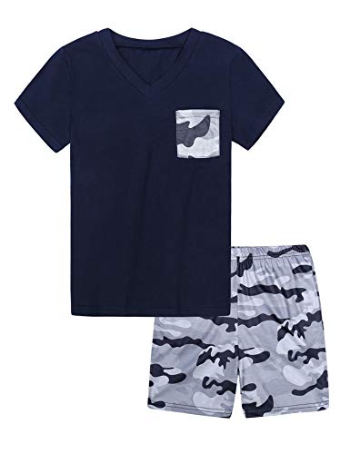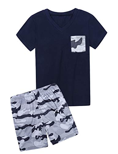 Hawiton Pijama niño Verano Corto,Ropa de Dormir de Camuflaje de Manga Corta, para 4-5 años, Camiseta con Bolsillo en el Pecho y Pantalones Corta 2 Piezas