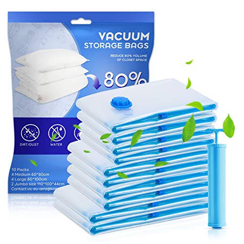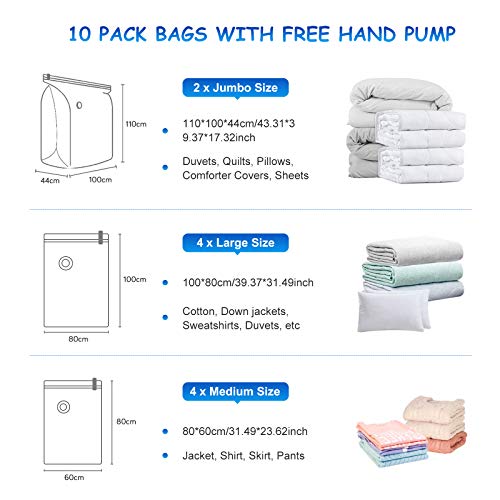 - 3 Tamaños-10 Bolsas de Vacío: 2* Jumbo Cube(110x100x44cm)+4* Grandes(100x80cm)+4*medias(80x60cm). Las exclusiva 3D bolsas pueden ayudarle a almacenar almohadas o edredones fácilmente. Se puede ahorrar espacio hasta 80%. Fácil de poner las cosas en el armario, en la maleta, etc.
