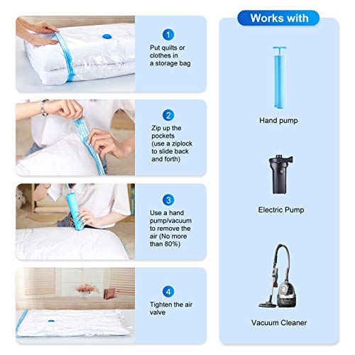 - Con 20 bolsas de distintos tamaños, este pack es ideal para mudanzas, en el hogar, en el trabajo, para viajes o simplemente para el almacenamiento en general. Reduzca hasta en un 80 % el espacio necesario para almacenar artículos voluminosos como edredones. Mejor aún, hemos incluido una bomba de mano gratis
