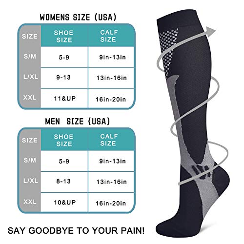 - Tamaño ajustable: calcetines de compresión unisex que se adaptan perfectamente a las piernas y los pies, tienen más flexibilidad y un espacio ajustable y son fáciles de poner y quitar. Tienen 3 tamaños diferentes para elegir nuestros calcetines de compresión basados en el tamaño de tu tobillo y pantorrilla.