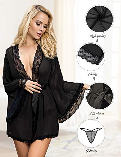 Erótica Kimono de Encaje Transparente con Cinturón Satén, Sexy Conjunto de Lencería con Mangas Largas Ropa Interior de Dormir Camisón Traje de Baño para Mujer Damas + Tanga G-String (Negro)