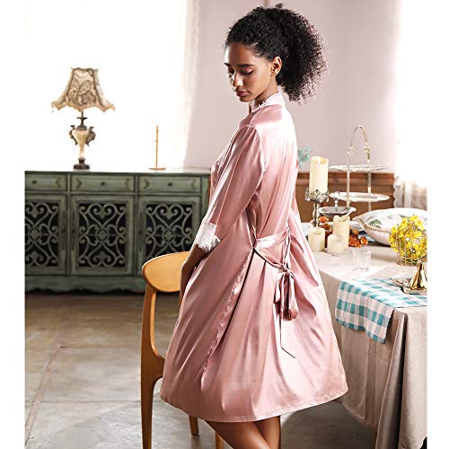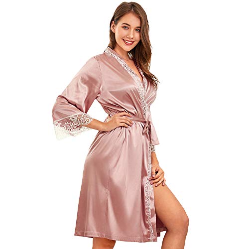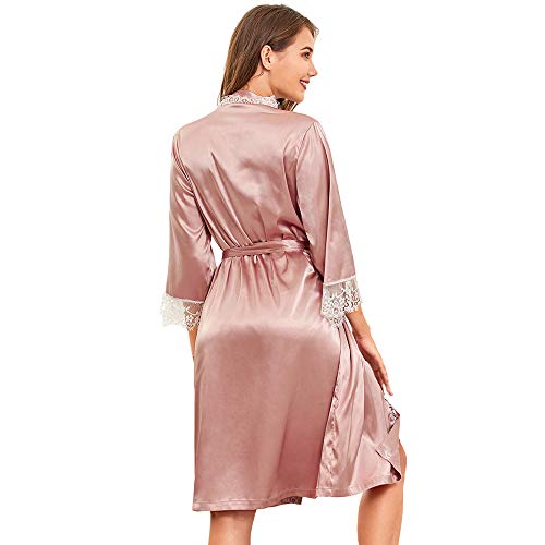 SHEKINI Kimono Mujer Batas Elegante Pijama 3/4 Manga con Cinturón Satén Camisón Sexy(S,Rosa Claro