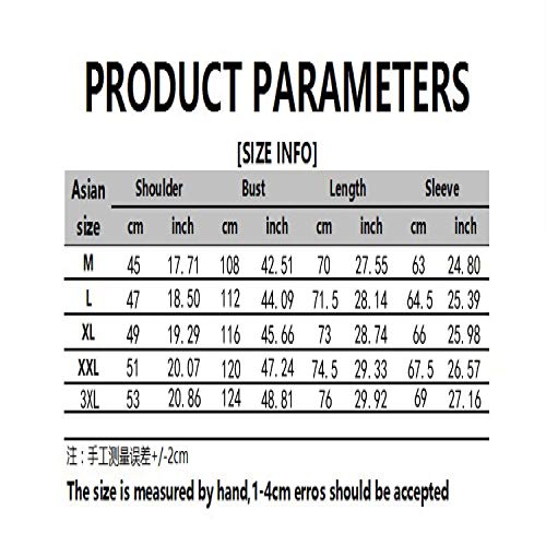 - Por lo general, el tamaño tiende a ser pequeño, elija el tamaño de acuerdo con la siguiente tabla de tamaños, consulte primero el peso y luego según la altura, tenga en cuenta, gracias S (peso: 45-50 kg ---- altura: 150-160 cm) / M (peso: 50-55 kg ---- altura: 155-165 cm) / L (peso: 55-60 kg ---- altura: 160-170 cm) / XL (peso: 60-65 kg --- altura: 165-175 cm) / 2XL (peso: 65-70 kg --- altura: 170-180 cm) / 3XL (peso: 70-75 kg --- altura: 175-185 cm) /