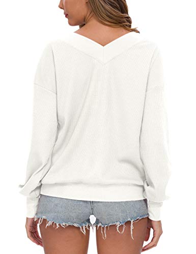 AUSELILY - Jersey de Punto para Mujer, Cuello en V, Manga Larga, Informal, sin Hombros.(EU 36-38,Blanco)