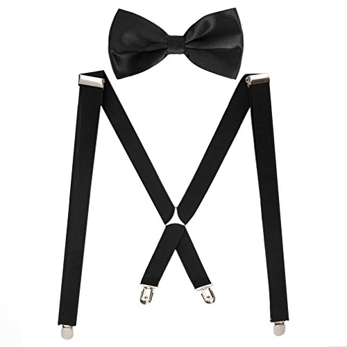 HBF 1 Conjunto Tirantes Y Pajaritas Unisex Elástica Ajustable X-Forma 4 Clips Ancho 2.5 Cm Para Hombre Y Mujer (Negro)