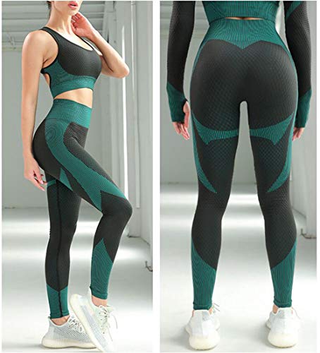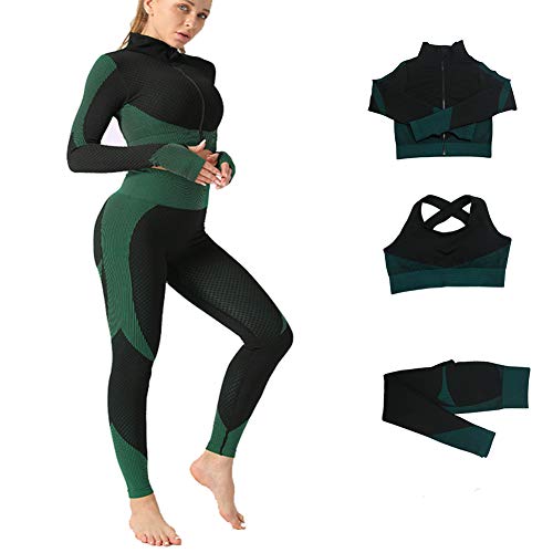Veriliss 3 Piezas Mujer Yoga Traje Entrenamiento Para, Gym Mallas de Yoga Sin Costuras y Sujetador Deportivo Elástico Ropa de Gimnasio (PavorealAzul, S)