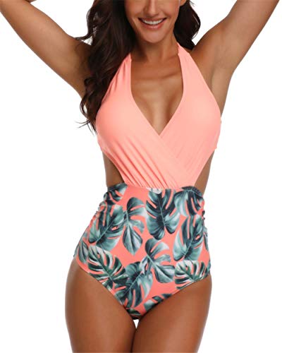 Bikinis Mujer Push Up, Mujeres Acolchadas Sexy Floral con Cordones de Impresión Sin Espalda Bikini Halter Una Pieza de Baño,Naranja,M