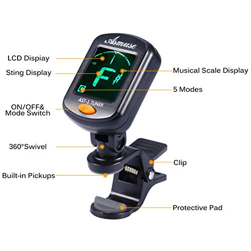 Asmuse Afinador para Guitarra, Violín, Ukelele, Bajo Eléctrico, Apagado Automático, Sintonizador Cromático Universal con 3 Selecciones de Alice Pantalla LCD 360 ° Batería Incluida