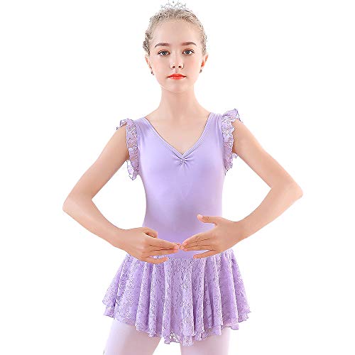 Soudittur Maillot de Ballet Niña Vestido de Danza Baile Tutú Leotardo Algodón Gimnasia Clásico Sin Mangas con Faldas de Encaje en Morado (10-11 Años)