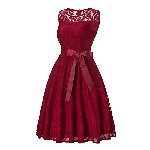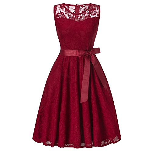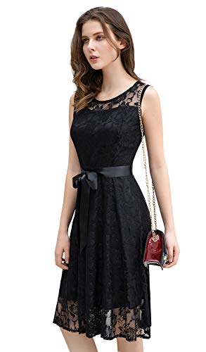 Vestido Mujer de Encaje Corto Vestido de Fiesta Vestido de Cóctel Sin Manga con Lazo Cuello V y Cuello Redondo para Madrina Fietsa Boda Ceremonia y Eventos