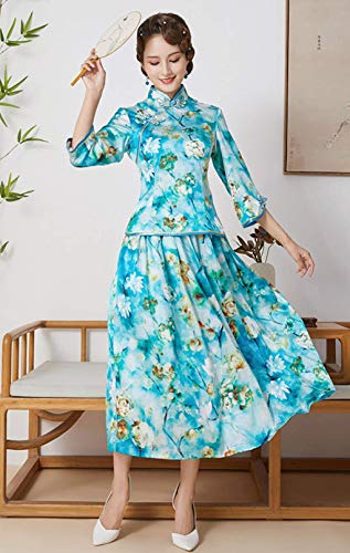 Cheongsam Seda Agua impresión Qipao Blusa Falda de Dos Piezas Conjunto Vestido Chino para Las Mujeres 3247 XL