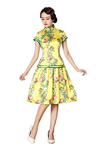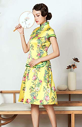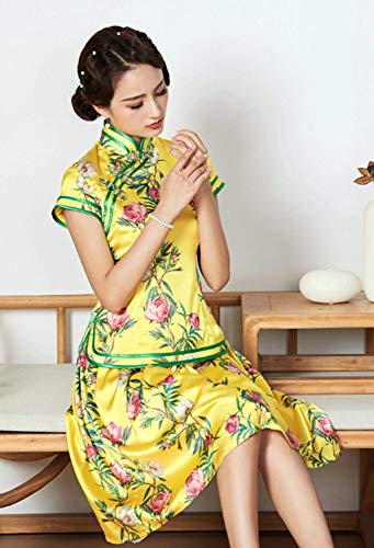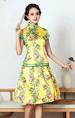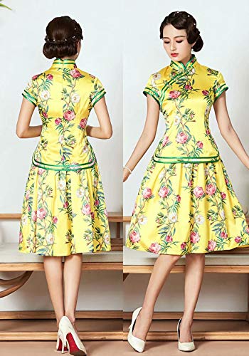 Seda impresión Qipao Blusa Falda Dos Piezas Conjunto Amarillo Vestido Chino para Las Mujeres 3249 S