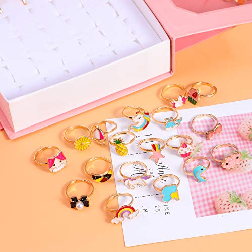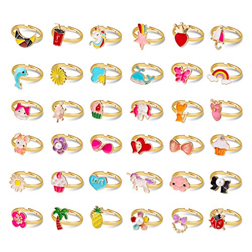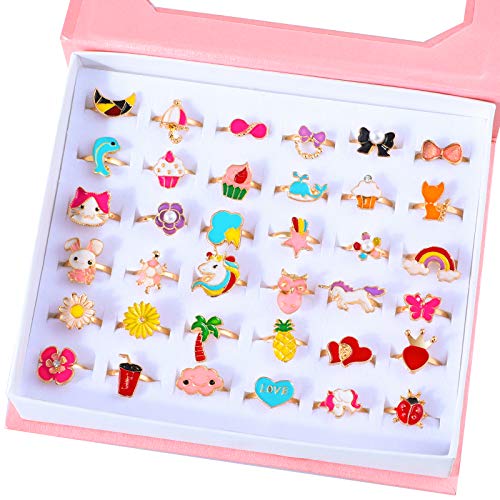 Hifot Anillos Ajustables para niñas 36 Piezas, Princesa Ladybug Mariposa Flor Unicornio Anillos de Dedo con Joyero, Regalo Anillos niñas pequeñas Artículos de Fiesta Vestidos Accessorio