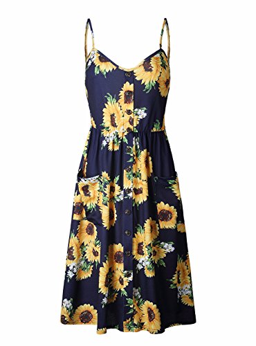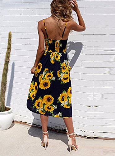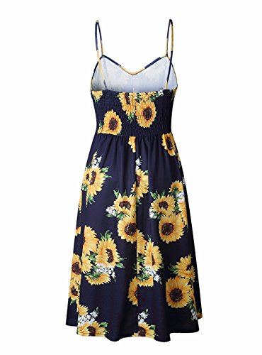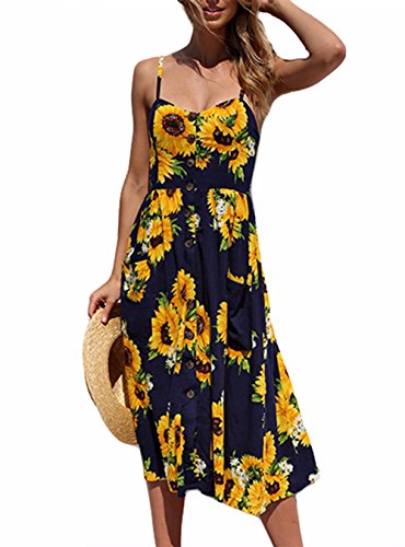 FASTYLING Vestido de verano retro con cuello en V de una línea sin mangas con botones en la espalda Vestido de playa con girasol Vestido de tirantes