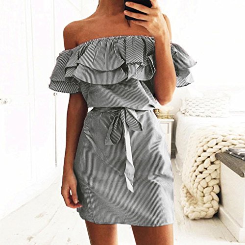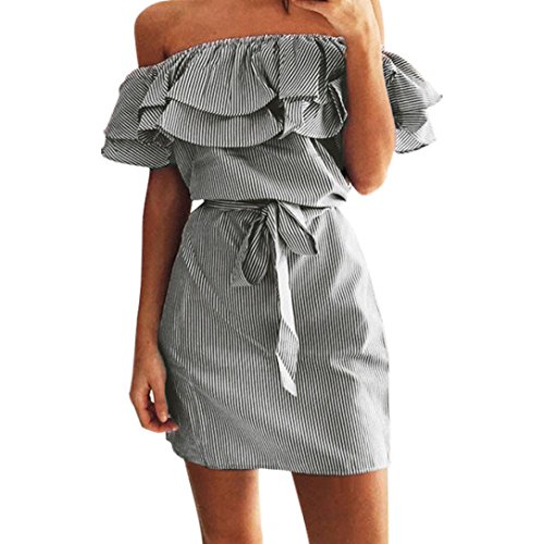 OverDose mujer De Verano A Rayas del Hombro Volante Vestido con Correa De Vacaciones De Playa Sombrero Sexy Mar Mini Corto Vestido Plus (M, Negro)