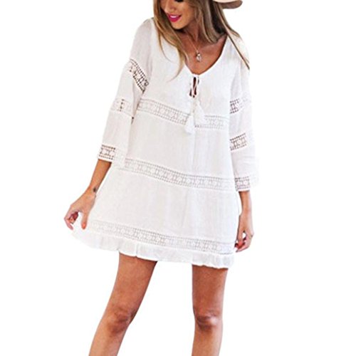 SHOBDW mujer Tres Cuartos de Manga Suelta Encajes Playa Bohemio Corto Mini Vestido día de San Valentín Presente (Blanco, XL)