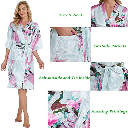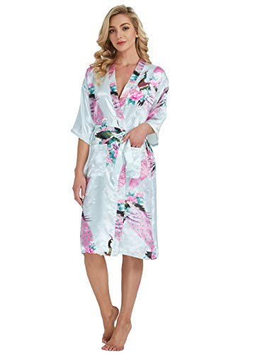 Westkun Kimono Japones Mujer Albornoz Vestido de Satén Pavo Real Novia Pijamas Largo Sexy y Elegante de Seda Bata Camisón Robe Lencería Cardigan(Azul Claro,XXL)