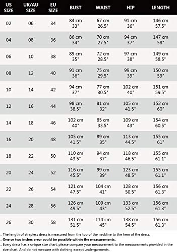 - La tabla de tallas de Amazon junto a la opción de tallas es incorrecta. Mire la medida del vestido en Descripción del producto. El tallas europeo es solo de referencia: EU 34(XS), EU 36/38 (S), EU 40/42 (M), EU 44 (L), EU 46 (XL), EU 48 (XXL)