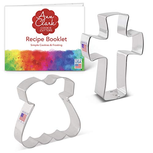 Ann Clark Cookie Cutters Juego de 2 cortadores de galletas bautizo / primera comunión con libro de recetas, vestido y cruz cristiana