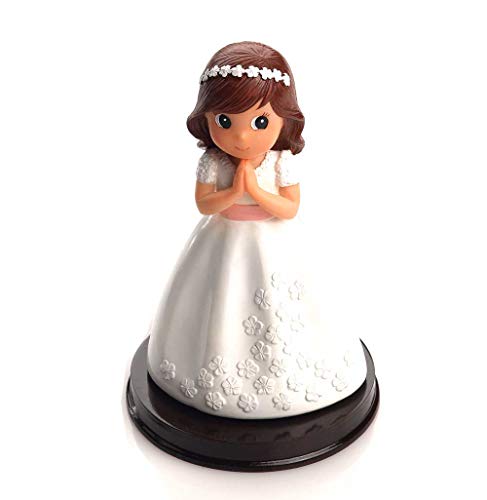 - Figura para el pastel o la tarta de Primera Comunión niña vestida con traje blanco con adornos en rosa.