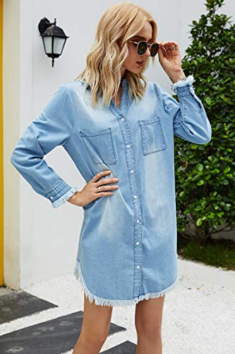 Vestidos Camisero de Denim para Mujer De Manga Larga Borlas Jeans Vestido Casual con Botones Azul Claro S