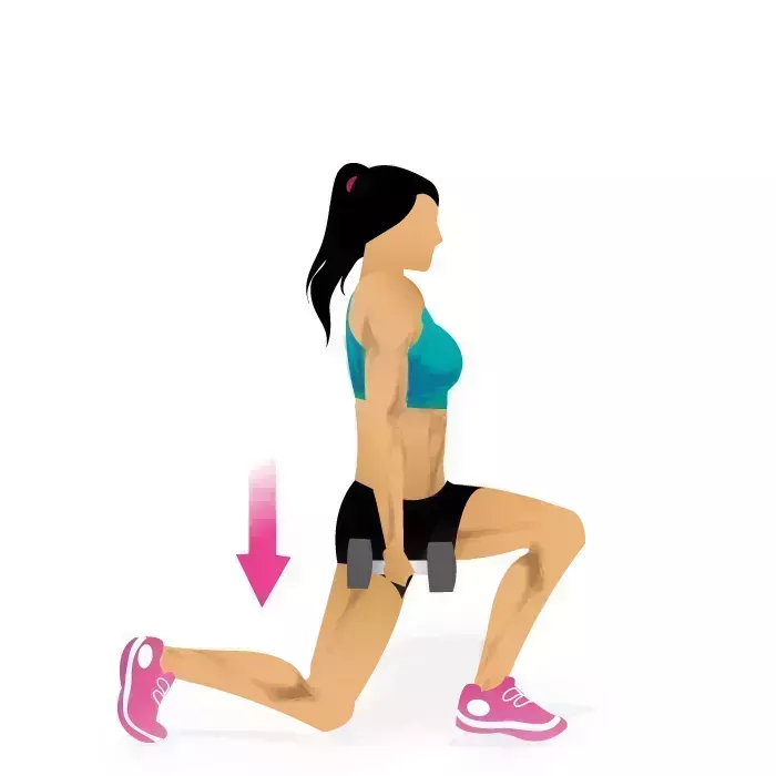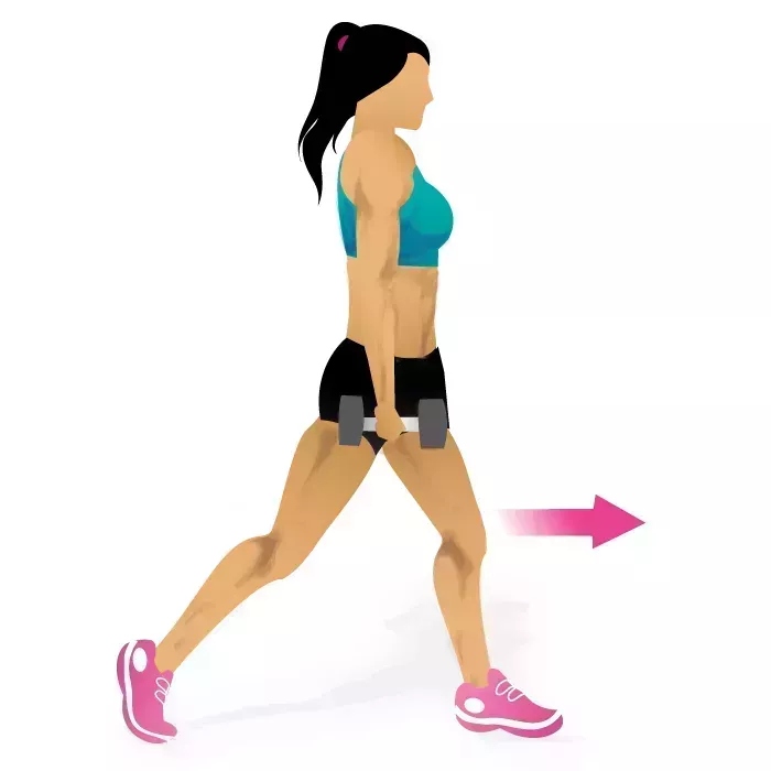 - Da un paso adelante con una pierna hasta que tu espinilla y tu muslo formen un ángulo de 90 grados (inhala durante este movimiento).