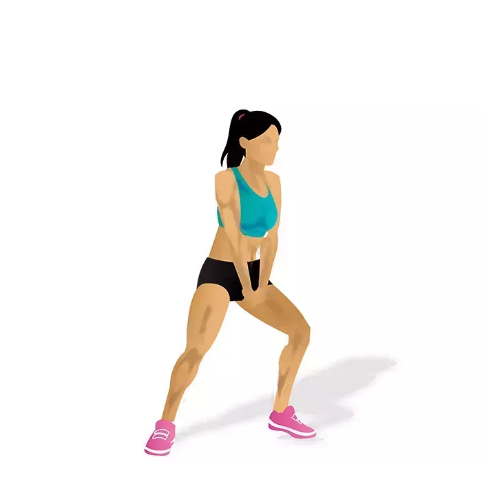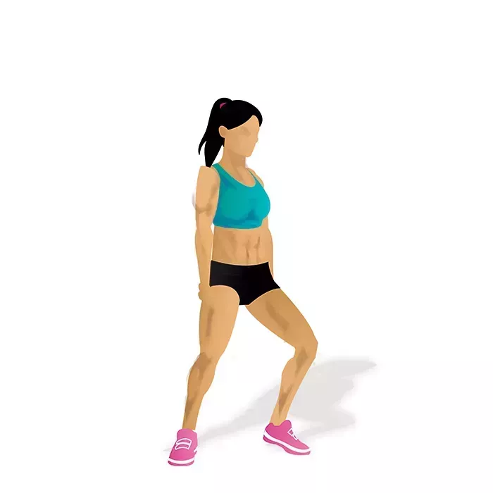 Posición inicial: De pie, con los pies colocados a más de la anchura de los hombros y los dedos de los pies apuntando ligeramente hacia fuera. Durante todo el ejercicio, asegúrese de mantener la cabeza alta y la espalda recta.