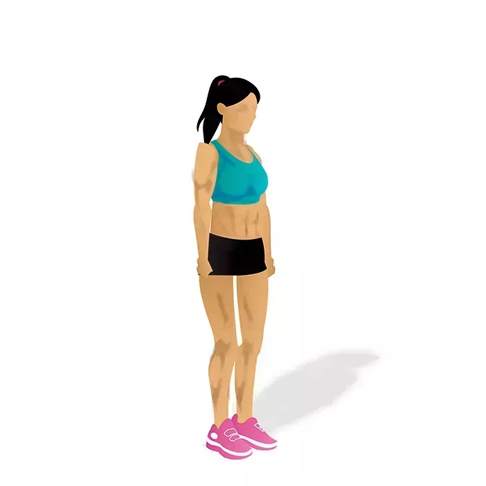 Posición inicial: Ponte de pie con los pies colocados a la anchura de los hombros, con los dedos de los pies apuntando ligeramente hacia fuera. Estire los brazos. Mantenga la cabeza levantada y la espalda recta durante todo el ejercicio.